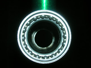 In 26 hours we will be at the airport waiting for our plane. Janice and I have both been working hard the last couple days, but there is still more to do. My mind and my hands have been busy battling the mighty forces of Entropy, and the battle is not over yet. Will it ever end? Entropy, or the tendency of things to move to a state of disorder, seems to be everywhere. Although the bikes are finally ready, they still need to be boxed. And then there is the matter of packing our bags. My bedroom is just dripping with Entropy and I sometimes feel like I'll never see order or neatness again. But I plod onward. Moving, shifting, rebuilding--compartmentalizing the pieces of my life. The headset bearings that were once dirty are now smooth and packed with fresh grease (I took this photo before I added the grease). It's 2:30 in the morning, and in the quiet of my basement I can feel the tides turning. The smell of victory mixes with the smell of Simple Green. A cup of tea is falling asleep next to me. When the sun comes up old Mr. Entropy will be on his way out of town.