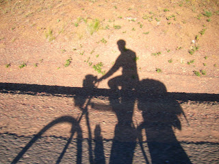 Ok, here is a photo of my shadow. My shadow moves beside me. With his shadowy wheels he moves over the sand and the road with surprising ease. He is silent and he keeps his face hidden. As the sun moves my shadow changes shape and size, and this too is fun to watch.