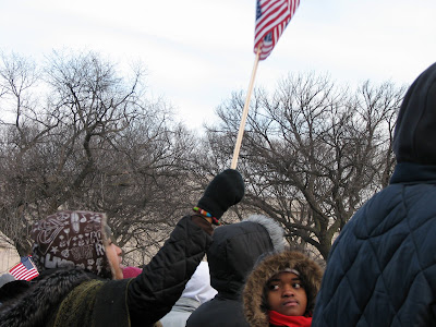 At just past 8:00 a.m. they started replaying Sunday's concert on the jumbotron. Bruce Springsteen started things off with a rocking version of "The Rising." People started cheering and dancing. Famous people spoke in between the songs: Laura Linney, Tom Hanks, Jack Black, Tiger Woods, and the eldest son of Martin Luther King, Jr. They brought up the names of the great American heroes: Abraham Lincoln, Franklin Delano Roosevelt, John F. Kennedy, Rosa Parks, Martin Luther King, Jr. Inspirational people from the past. All eyes were fixed on the large screen. People danced and sang along to what appeared to be a truncated version of "American Pie." James Taylor played his song, "Shower The People." Then U2 came out and honored the spirit of Martin Luther King, Jr. with their song "Pride (In The Name of Love)." A great song for a great day. The emotions were very strong and I felt the tears pool up in my eyes. As an American and a human being, I knew that I was tied to a long and painful history. The evolution of Love has not been easy. The sins of the past and the present saddened me deeply, but as I heard that Irish band play, I was reminded of the power of Love and the great potential of the human race. And all around me I saw the proof that King's Dream was still alive. His love and his strength were alive in the hearts and the minds of the people around me. We the American People had chosen Barack Obama to lead us because we wanted to make things better, not only for ourselves and for our families, but also for our America and for our World.