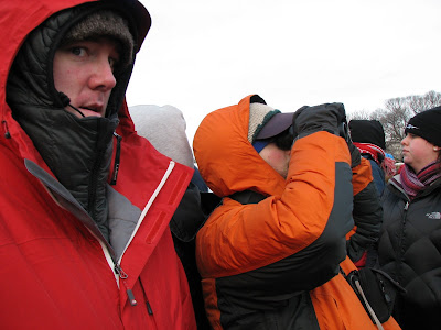 The scene was quiet and cold as we stood there in the crowd waiting for time to pass. People huddled on the ground and tried to sleep. Janice and Abe sat down to rest for a little bit. I kept standing, taking photos and writing in my notebook. I ate a couple small bags of trail mix and sipped a little cold water. Calories are king when it's cold out.
